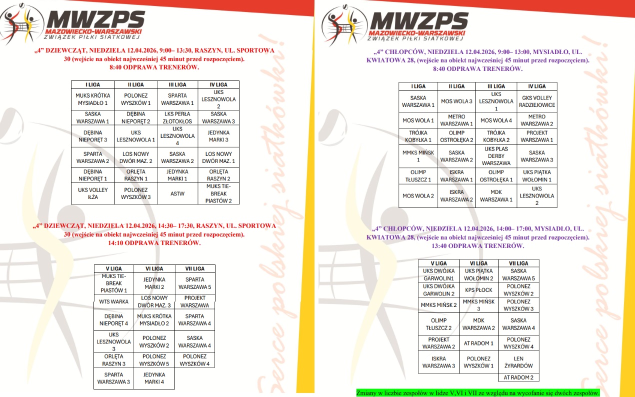 „4” DZIEWCZĄT, NIEDZIELA 12.04.2026, 9:00– 13:30, RASZYN, UL. SPORTOWA 30