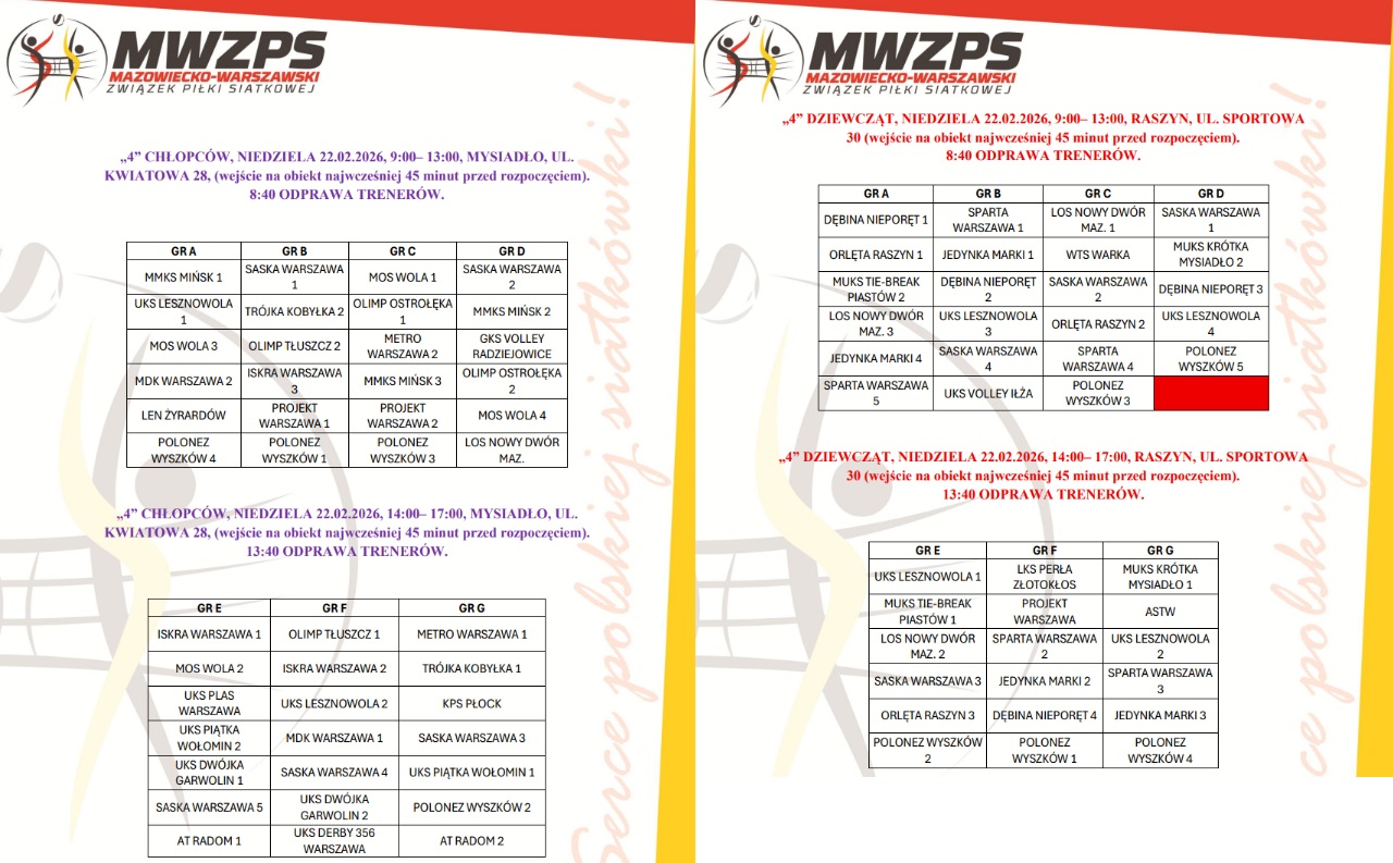 „4” DZIEWCZĄT, NIEDZIELA 22.02.2026, 9:00– 13:00, RASZYN, UL. SPORTOWA