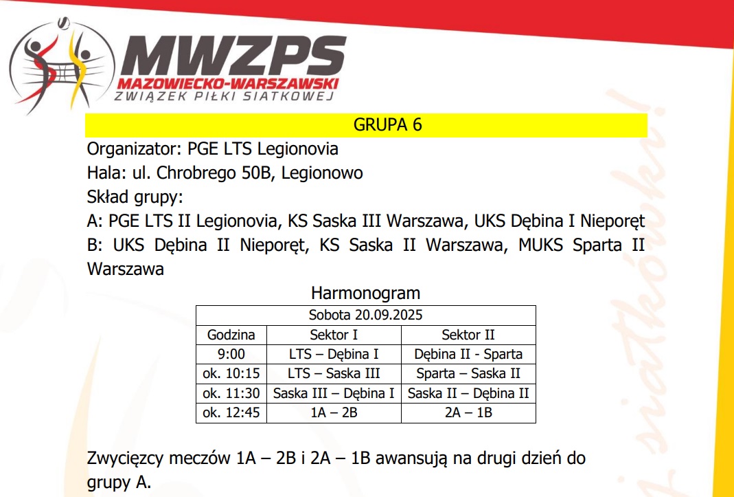 A: PGE LTS II Legionovia, KS Saska III Warszawa, UKS Dębina I Nieporęt